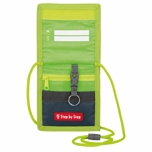 Im Step by Step Brustbeutel ist alles griffbereit. Das Taschengeld für das Pausenbrot findet seinen Platz im Münzfach mit Reißverschluss und die Busfahrkarte kann im Klarsichtfach untergebracht werden. Dank der Kordel können Kinder sich den Geldbeutel um den Hals hängen und so nicht verlieren. Der Haustürschlüssel kann an der abnehmbaren Schlüsselbefestigung angebracht werden. Im Inneren des Umhänge-Beutels befindet sich ein Feld, in den Name und Adresse eingetragen werden können. Das Material ist strapazierfähig und wasserabweisend mit PFC-freier Beschichtung. Die Herstellung erfolgt klimaneutral und vegan.