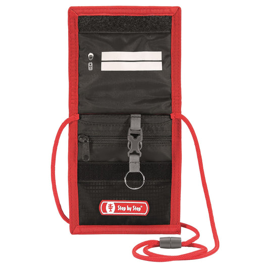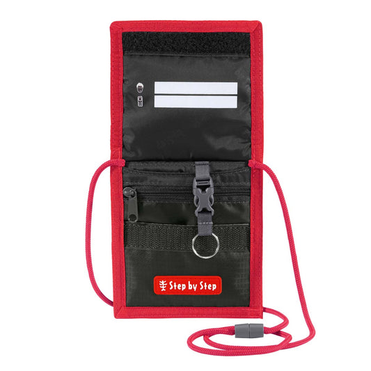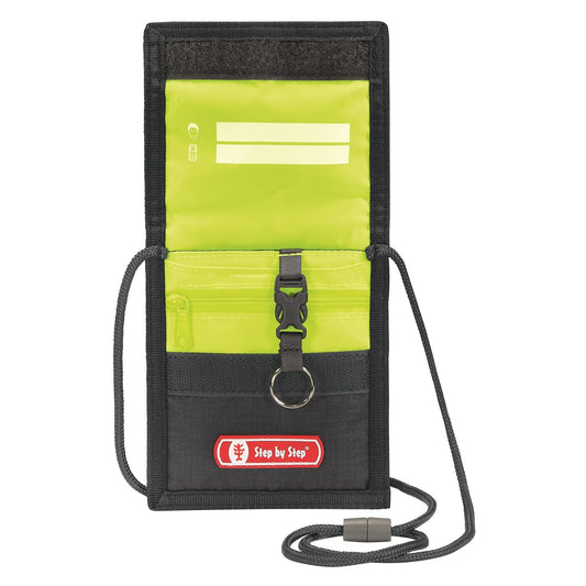 Im Step by Step Brustbeutel ist alles griffbereit. Das Taschengeld für das Pausenbrot findet seinen Platz im Münzfach mit Reißverschluss und die Busfahrkarte kann im Klarsichtfach untergebracht werden. Dank der Kordel können Kinder sich den Geldbeutel um den Hals hängen und so nicht verlieren. Der Haustürschlüssel kann an der abnehmbaren Schlüsselbefestigung angebracht werden. Im Inneren des Umhänge-Beutels befindet sich ein Feld, in den Name und Adresse eingetragen werden können. Das Material ist strapazierfähig und wasserabweisend mit PFC-freier Beschichtung. Die Herstellung erfolgt klimaneutral und vegan.
