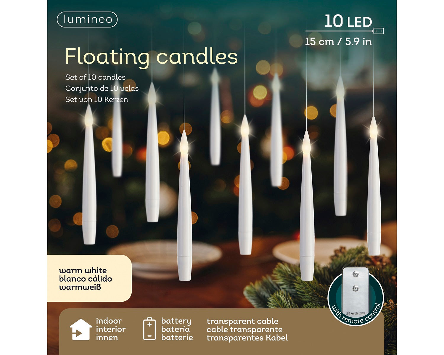 Die 10 schwebenden LED Kerzen, erstrahlen in einem warm weißen Farbton und werden mit einer Fernbedienung gesteuert. Die LED-Technologie sorgt zudem für eine lange Batterielaufzeit von rund 80 Stunden. Die Kerzen sind nur für den Innenbereich konzipiert.