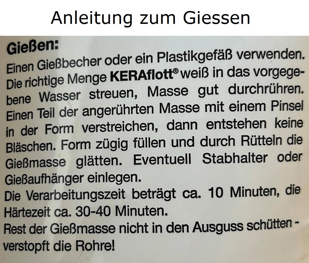 Anwendung: Einen Gießbecher oder ein Plastikgefäß verwenden. Die richtige Menge KERAflott in das vorgegebene Wasser streuen und die Masse gut durchrühren. Einen Teil der angerührten Masse mit einem Pinsel in der Form verstreichen, dann entstehen keine Bläschen. Form zügig füllen und durch Rütteln die Gießmasse glätten. Evtl. einen Stabhalter oder Gießaufhänger einlegen. Die Verarbeitungszeit beträgt ca. 10 Minuten, die Härtezeit ca. 30-40 Minuten. Der Rest der Gießmasse nicht in den Ausguss schütten, ansonsten können die Rohre verstopfen! Bei trockener Lagerung ca. 1 - 2 Jahre haltbar.