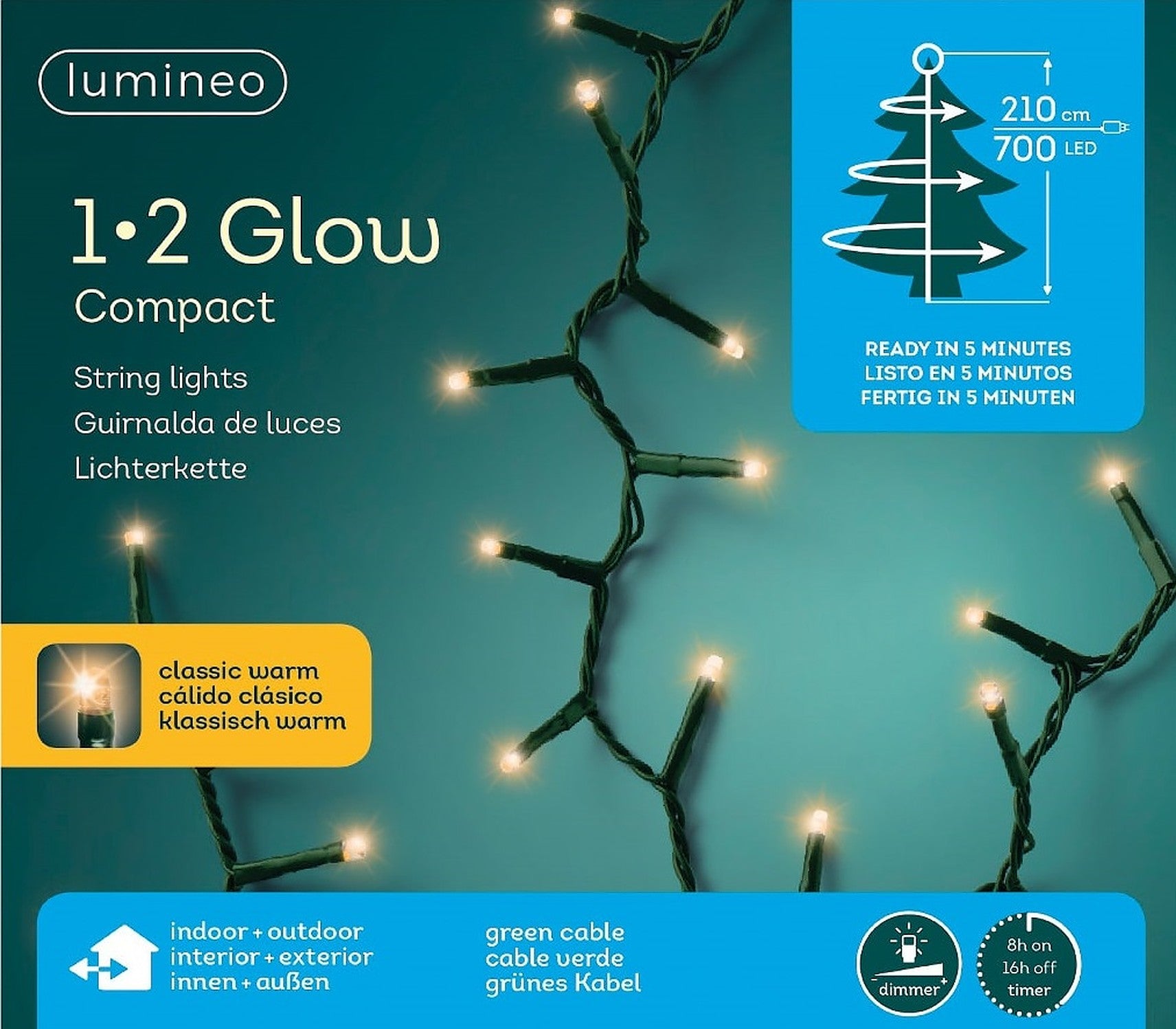 Die Lichterkette verfügt über 700 LEDs die in einem warm weißen Ton erstrahlt. Das grüne Kabel fügt sich nahtlos in den Weihnachtsbaum ein und lässt die Lichter in voller Pracht erstrahlen. Die Beleuchtung ist für Weihnachtsbäume bis zu einer Höhe von 2,1 m geeignet. Die LEDs sind auf 7 Strängen mit folgenden Längen aufgeteilt: 4 m, 3,5 m, 3 m, 2,5 m, 2 m, 1,5 m und 1 m. Befestigt wird sie mit einem Gummi-Ring oben am Baum. Die Dimm-Funktion ermöglicht es, die Helligkeit nach Belieben in 5 unterschiedlichen Stufen anzupassen. Dank der praktischen Timer-Funktion lässt sich die Lichterkette ganz bequem steuern, sodass sie automatisch 8 Stunden lang eingeschaltet und 16 Stunden ausgeschaltet ist. Diese Funktion spart nicht nur Energie, sondern sorgt auch dafür, dass die Lichterkette jeden Tag zur gleichen Zeit erstrahlt. Die Beleuchtung bietet zudem eine großzügige 5 m lange Zuleitung, wodurch die LED-Kette eine Gesamtlänge von 7,1 m besitzt. Mit dem IP44-Schutz ist sie Wetterbeständig und somit gegen Spritzwasser geschützt. Sie ist für den Innen- und Außenbereich geeignet.