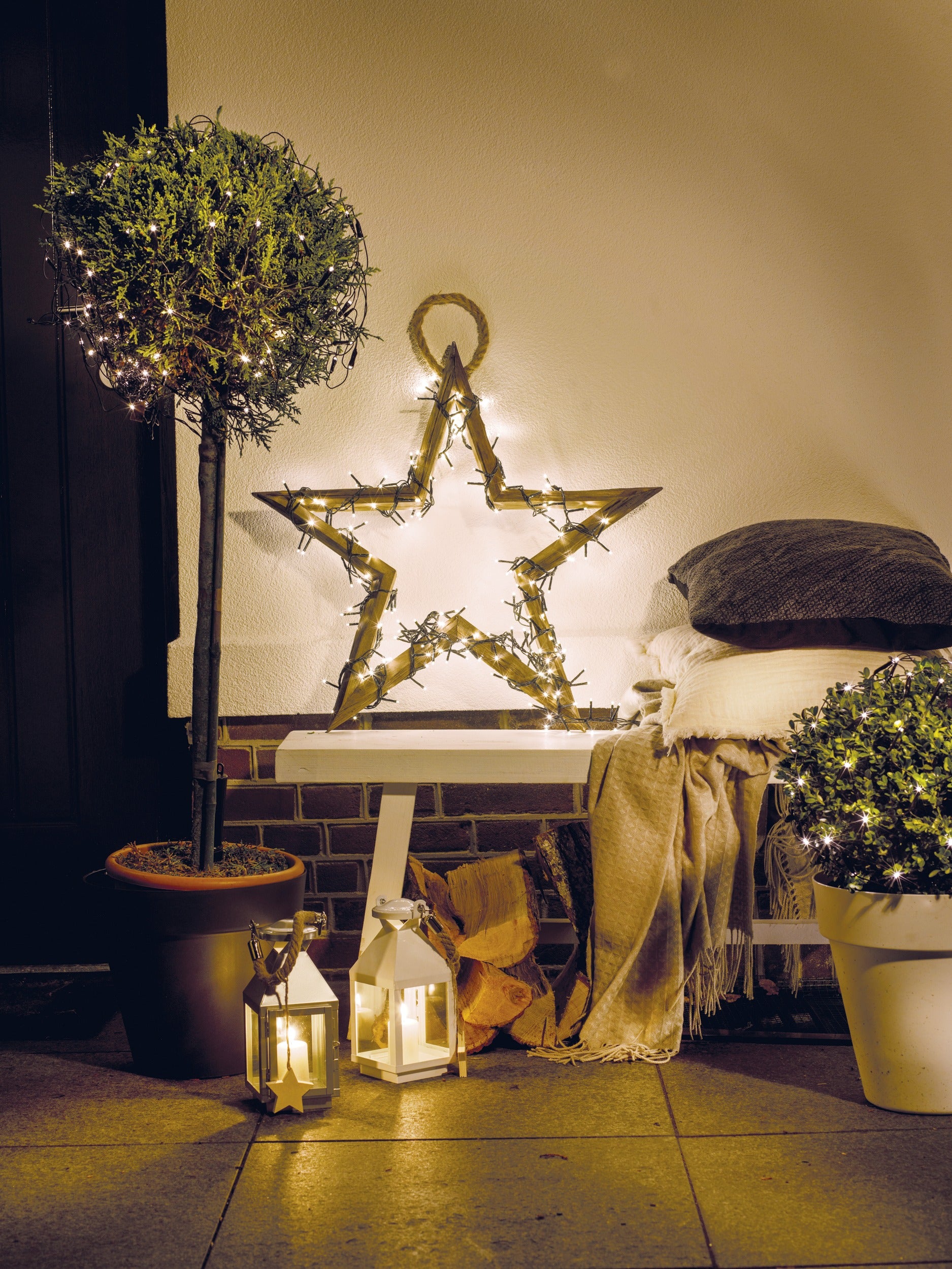 Die Lichterkette verfügt über 350 LEDs, welche in einem warm weißen Ton erstrahlen. Die 5 Stufen-Dimm-Funktion ermöglicht es, die Helligkeit nach Belieben anzupassen und somit die perfekte Atmosphäre zu schaffen. Dank der praktischen Timer-Funktion lässt sich die Lichterkette ganz bequem steuern, sodass sie automatisch 8 Stunden lang eingeschaltet und 16 Stunden ausgeschaltet ist. Diese Funktion spart nicht nur Energie, sondern sorgt auch dafür, dass die Lichterkette jeden Tag zur gleichen Zeit erstrahlt. Die Beleuchtung bietet zudem eine zusätzliche 5 m lange Zuleitung, wodurch die Lichterkette eine Gesamtlänge von 12,5 m besitzt. Mit dem IP44-Schutz ist sie Wetterbeständig und somit gegen Spritzwasser geschützt. Sie ist für den Innen- und Außenbereich geeignet. Für eine Baumhöhe von 120 - 150 cm geeignet. Mit Gütesiegel ausgezeichnet. Das Kabel ist grün.