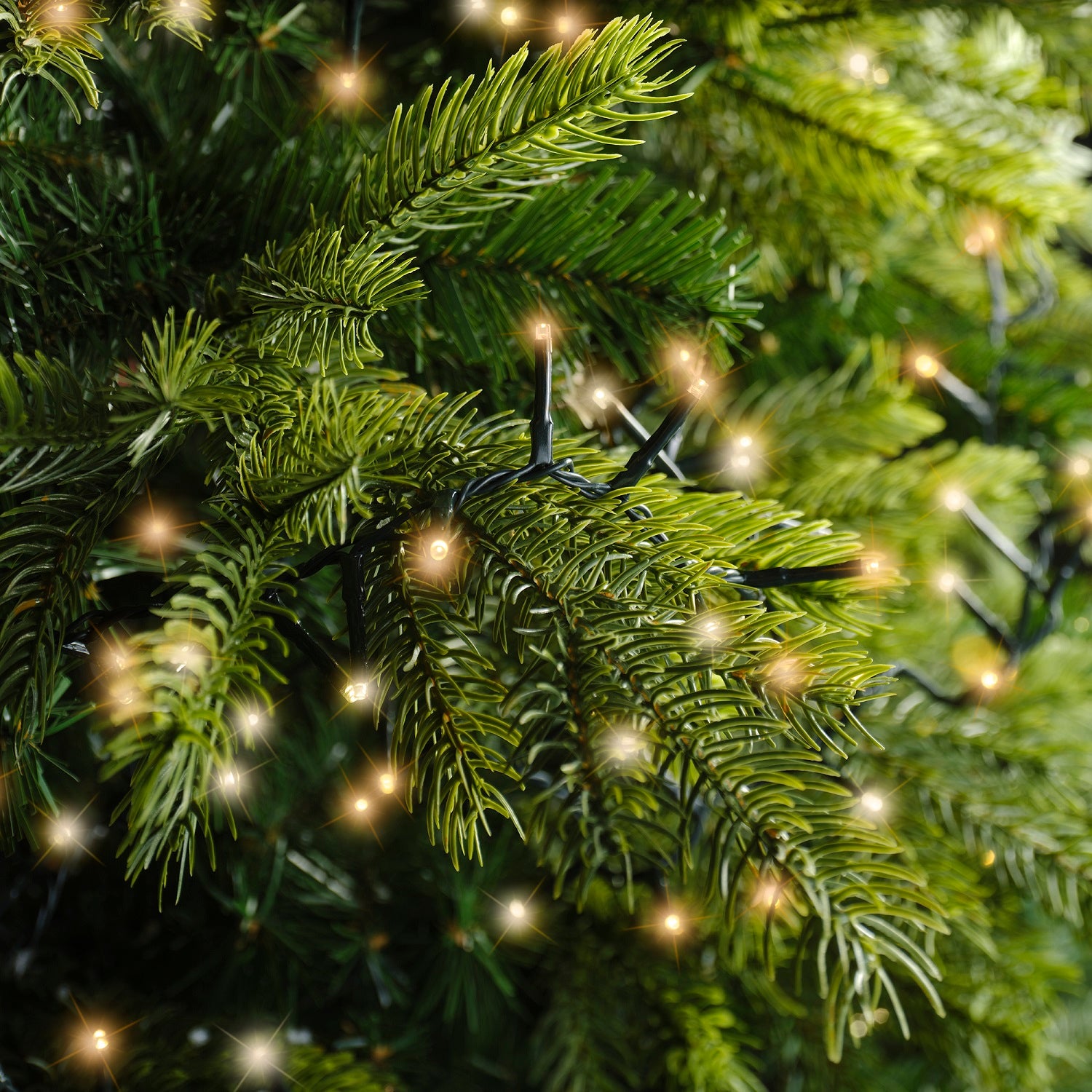 Die Lichterkette verfügt über 500 LEDs, welche in einem warm weißen sowie klassisch warmen Farbton erstrahlen. Die 5 Stufen-Dimm-Funktion ermöglicht es, die Helligkeit nach Belieben anzupassen und somit die perfekte Atmosphäre zu schaffen. Dank der praktischen Timer-Funktion lässt sich die Lichterkette ganz bequem steuern, sodass sie automatisch 8 Stunden lang eingeschaltet und 16 Stunden ausgeschaltet ist. Diese Funktion spart nicht nur Energie, sondern sorgt auch dafür, dass die Lichterkette jeden Tag zur gleichen Zeit erstrahlt. Die Beleuchtung bietet zudem eine zusätzliche 5 m lange Zuleitung, wodurch die Lichterkette eine Gesamtlänge von 16 m besitzt. Mit dem IP44-Schutz ist sie Wetterbeständig und somit gegen Spritzwasser geschützt. Sie ist für den Innen- und Außenbereich geeignet. Für eine Baumhöhe von 150 - 180 cm geeignet. Mit Gütesiegel ausgezeichnet. Die Lichterkette lässt sich nicht im Farbton switchen, sondern leuchtet im gemischten Ton.