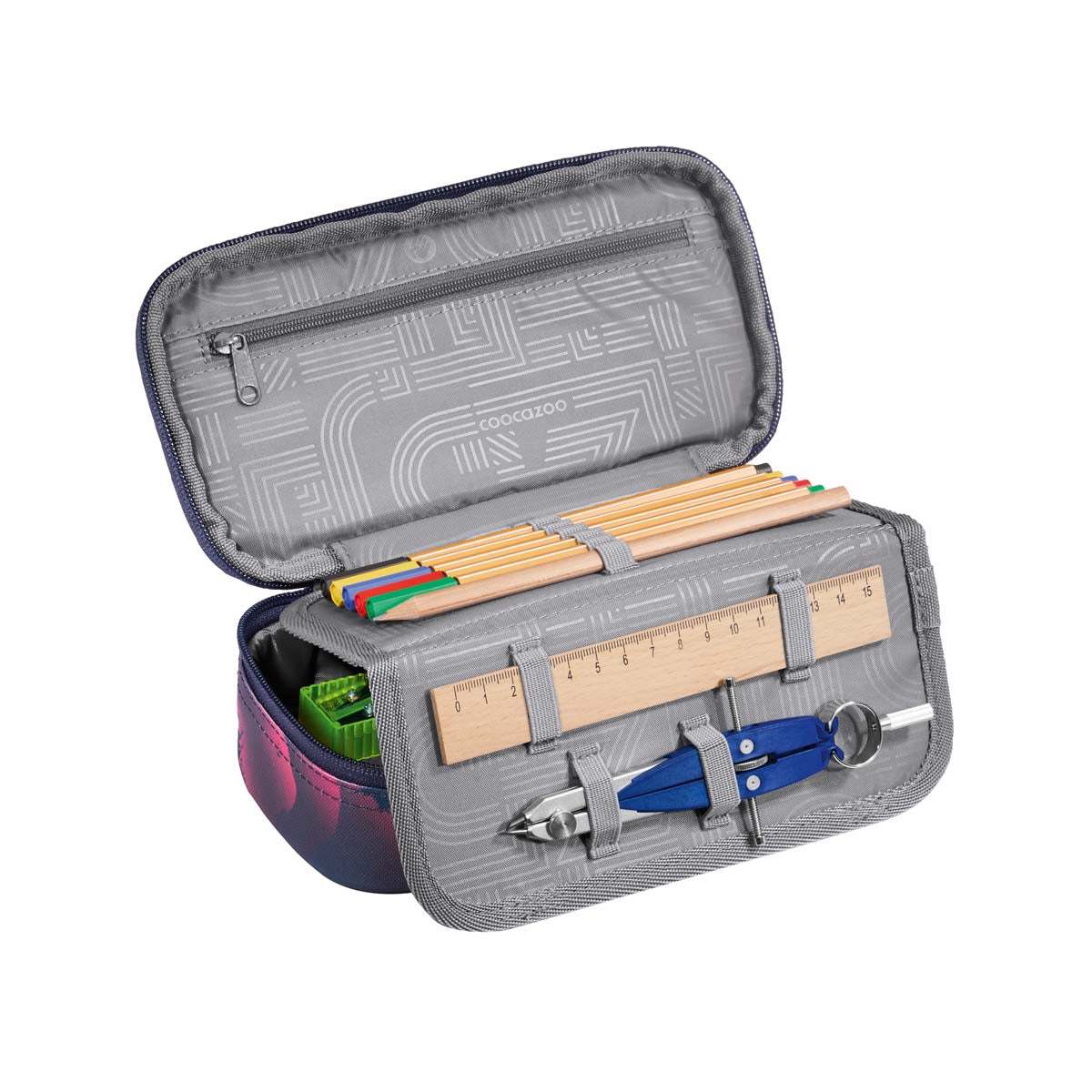 Das Pencilcase von Coocazoo bietet viel Platz für sämtliche Schreib- und Bastelutensilien. Aufgeteilt ist es in ein geräumiges Hauptfach, ein Reißverschlussfach, sowie ein Trennfach mit Organisationsfunktion, indem mehrere Stifte durch Gummibänder verstaut werden können. Damit Dein Kind den perfekten Durchblick im Schulalltag hat, ist ebenfalls ein separates Fach für einen Stundenplan integriert. Öffnen und schließen lässt es sich ganz einfach durch ein Reißverschluss-System. Mit austauschbarem Klett-Patch auf der Vorderseite. Die Herstellung erfolgt klimaneutral und umweltschonenden. Ein Mäppchen besteht aus 6 recycelten PET-Flaschen.