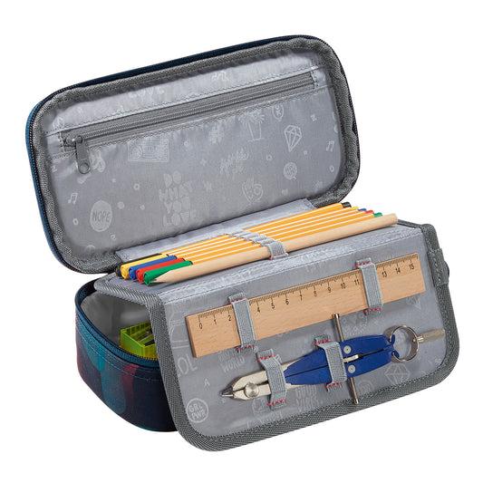 Das Pencilcase von Coocazoo bietet viel Platz für sämtliche Schreib- und Bastelutensilien. Aufgeteilt ist es in ein geräumiges Hauptfach, ein Reißverschlussfach, sowie ein Trennfach mit Organisationsfunktion, indem mehrere Stifte durch Gummibänder verstaut werden können. Damit Dein Kind den perfekten Durchblick im Schulalltag hat, ist ebenfalls ein separates Fach für einen Stundenplan integriert. Öffnen und schließen lässt es sich ganz einfach durch ein Reißverschluss-System. Die Herstellung erfolgt klimaneutral und umweltschonenden. Ein Mäppchen besteht aus 6 recycelten PET-Flaschen.