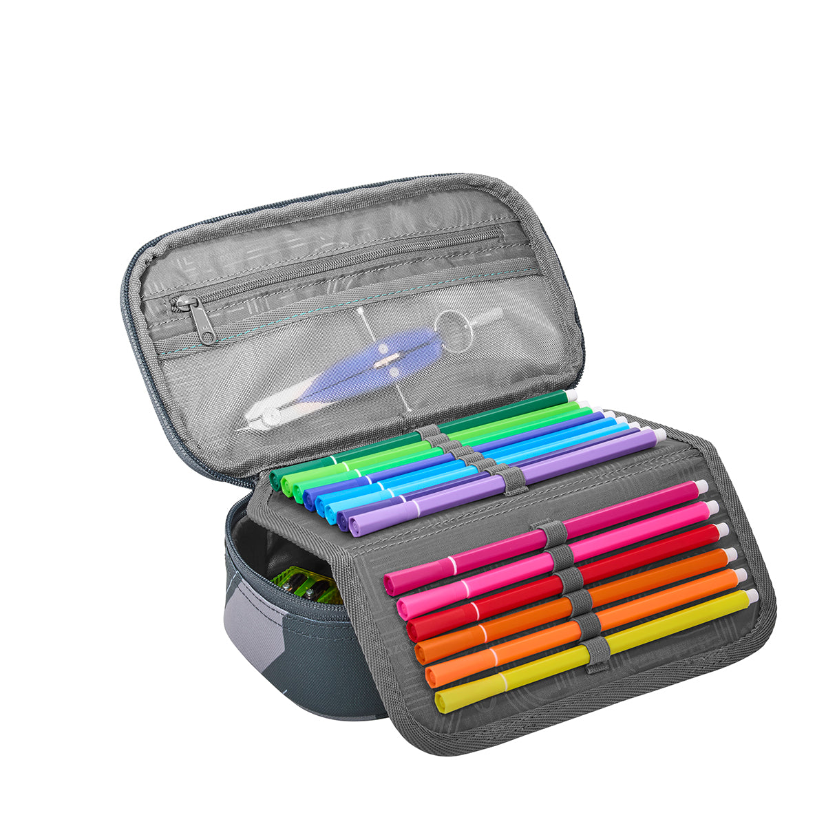 - auf dem klappbaren Flap können Stifte, Lineal, Zirkel, Stundenplan und Geodreieck verstaut werden