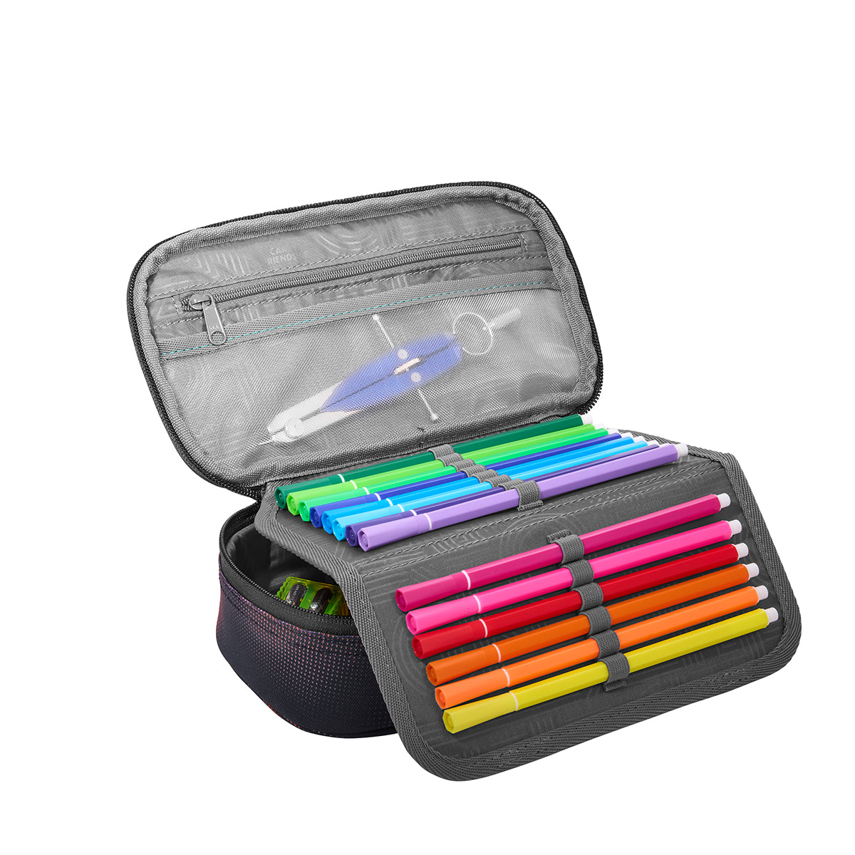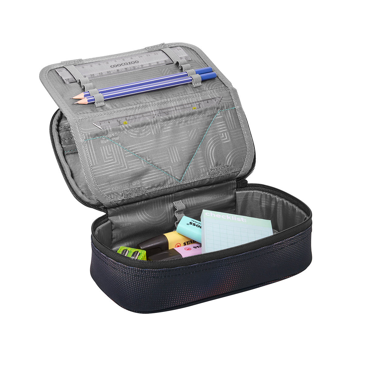 Das Pencilcase von Coocazoo bietet viel Platz für sämtliche Schreib- und Bastelutensilien. Aufgeteilt ist es in ein geräumiges Hauptfach, ein Reißverschlussfach, sowie ein Trennfach mit Organisationsfunktion, indem mehrere Stifte durch Gummibänder verstaut werden können. Damit Dein Kind den perfekten Durchblick im Schulalltag hat, ist ebenfalls ein separates Fach für einen Stundenplan integriert. Öffnen und schließen lässt es sich ganz einfach durch ein Reißverschluss-System. Die Herstellung erfolgt klimaneutral und umweltschonenden. Ein Mäppchen besteht aus 6 recycelten PET-Flaschen.