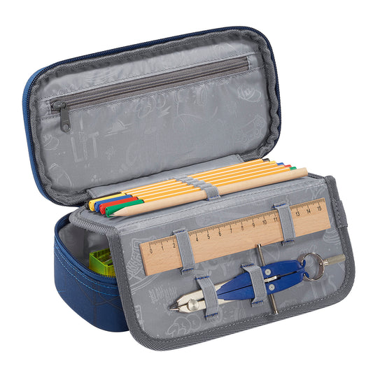 - auf dem klappbaren Flap können Stifte, Lineal, Zirkel, Stundenplan und Geodreieck verstaut werden