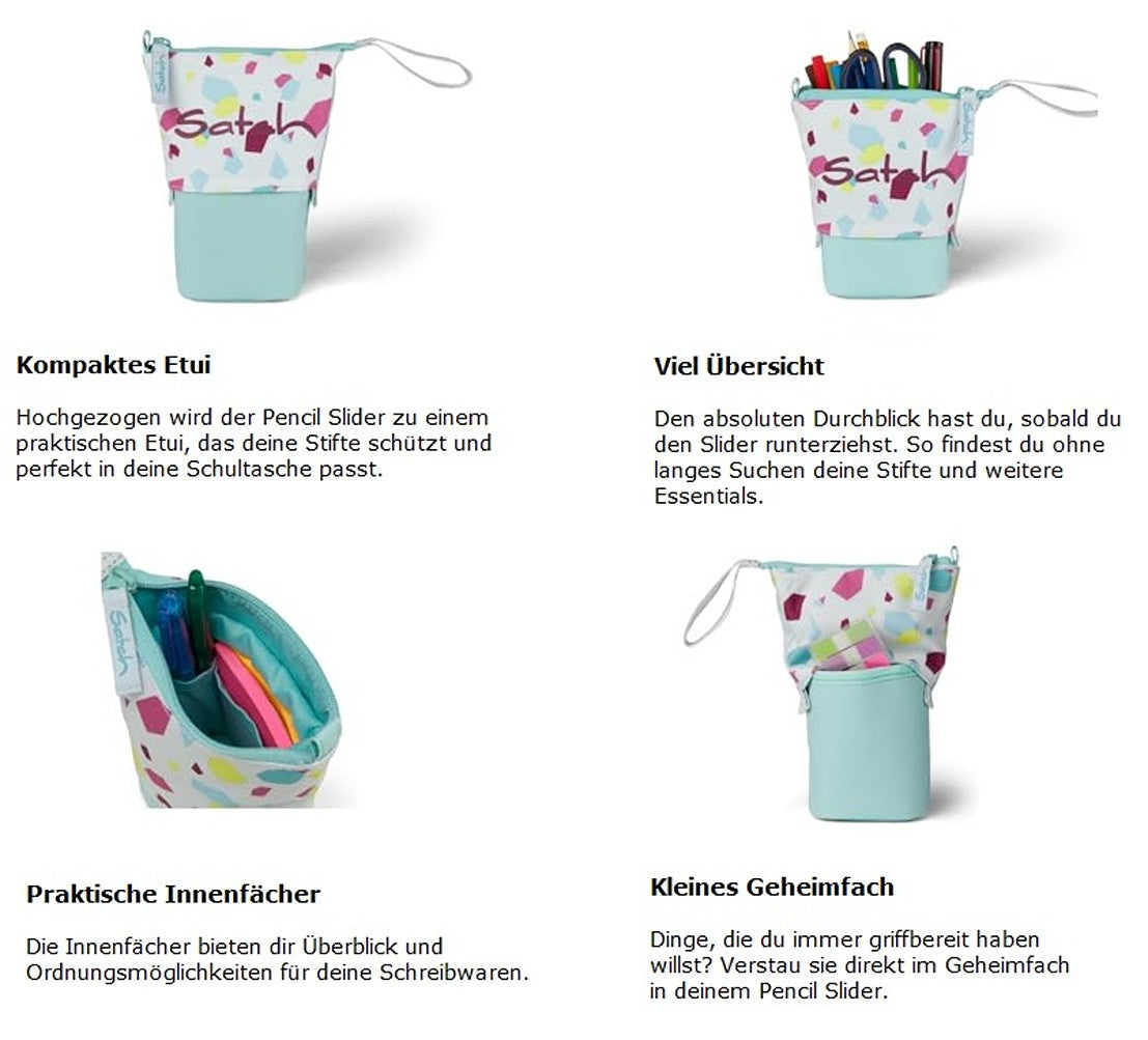 Das Pencilcase von Satch bietet viel Platz für sämtliche Schreib- und Bastelutensilien. Aufgeteilt ist es in ein Reißverschluss-Hauptfach mit 3 Innenfächer, sowie ein geheimes Fach. Durch die Slide-Down Funktion wird ein einfacher Zugriff ermöglicht. Das Etui ist standfest und eignet sich perfekt für die Schule. Klimaneutral und umweltschonenden aus 2 recycelten PET-Flaschen (0,5 l) hergestellt.
