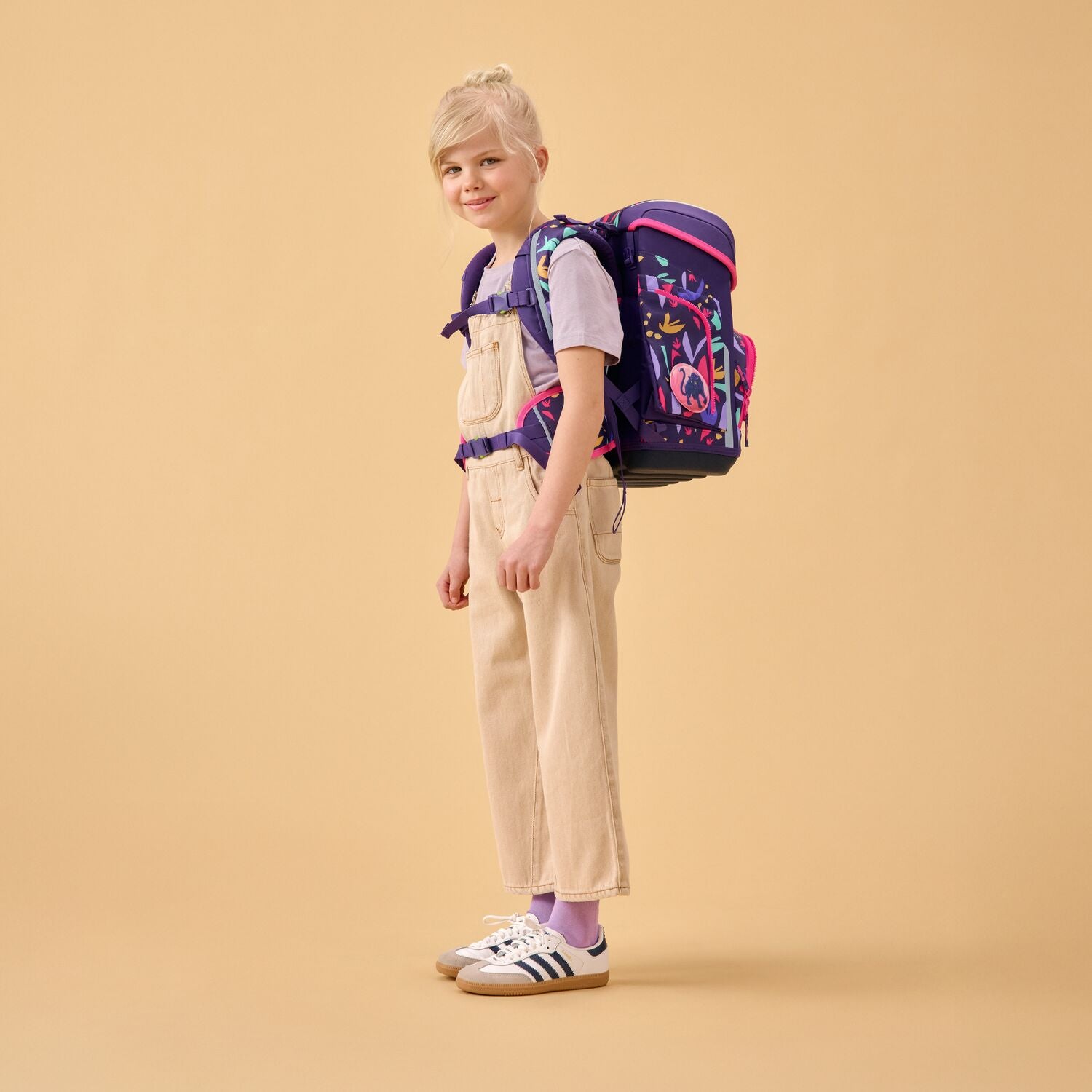 Der Tornister verfügt über mehrere Fächer, sowohl innen als auch außen, die ausreichend Platz für Bücher, Hefte und andere Schulutensilien bieten. Die fest angenähten Seitentaschen bieten zusätzlichen Stauraum für Trinkflasche oder einen Regenschirm. Der Schulrucksack ist rundherum mit Reflektoren ausgestattet, die eine gute Sichtbarkeit im Straßenverkehr gewährleisten. Eine stabile Bodenwanne sorgt zudem für einen sicheren Stand des Ranzens. Das Öffnen und Schließen des Schulranzens wird durch die Easy-Click-Magnetschnalle erleichtert.