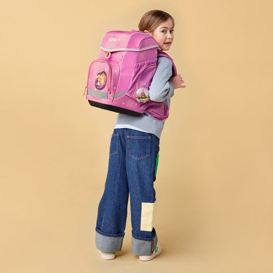 Der Tornister verfügt über mehrere Fächer, sowohl innen als auch außen, die ausreichend Platz für Bücher, Hefte und andere Schulutensilien bieten. Die fest angenähten Seitentaschen bieten zusätzlichen Stauraum für Trinkflasche oder einen Regenschirm. Der Schulrucksack ist rundherum mit Reflektoren ausgestattet, die eine gute Sichtbarkeit im Straßenverkehr gewährleisten. Eine stabile Bodenwanne sorgt zudem für einen sicheren Stand des Ranzens. Das Öffnen und Schließen des Schulranzens wird durch die Easy-Click-Magnetschnalle erleichtert.