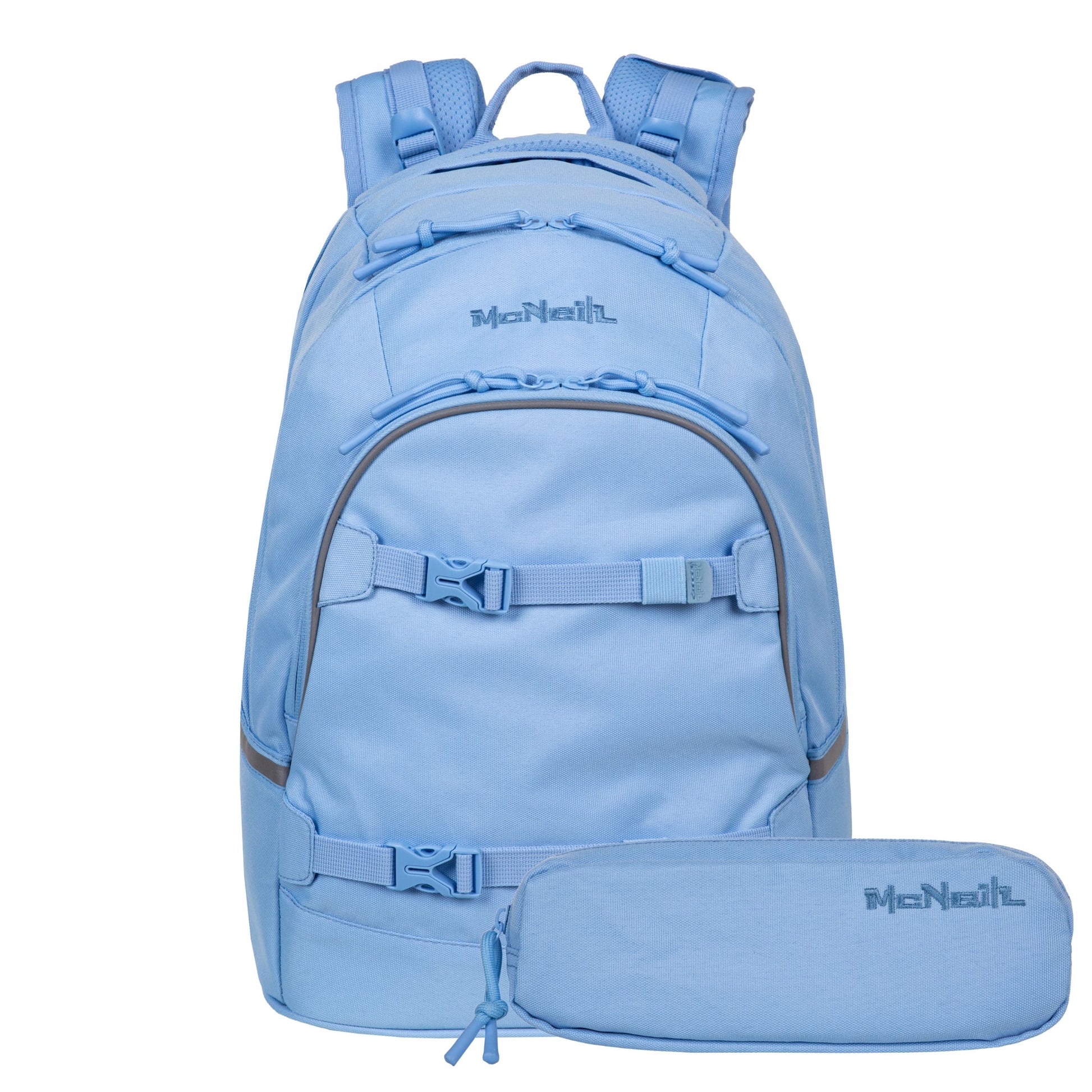 Der neue Schulrucksack MILO von McNeill. Die gepolsterten Rückriemen verleihen ein angenehmes und softes Tragegefühl und die eingearbeiteten Gummibänder verstärken diesen Tragecomfort in dem sie eine nachfedernde Eigenschaft haben. Die Ausstattung mit einem großen Hauptfach mit integrierten Bücherfach, Mittelfach mit Reißverschluß Innentasche und dem Frontfach mit 2 Reißverschluß Taschen, Organizer und Gurt mit Karabiner runden den Schulrucksack ab. Die trendigen Farben lassen den Schulalltag bunt erscheinen. Mit abnehmbaren Beckengurt und einstellbaren Brustgurt, der verstärkte wasserdichte Boden sorgt für einen sicheren Stand. Für die Belüftung am Rücken sorgt unser Air-Flow Rückensystem.