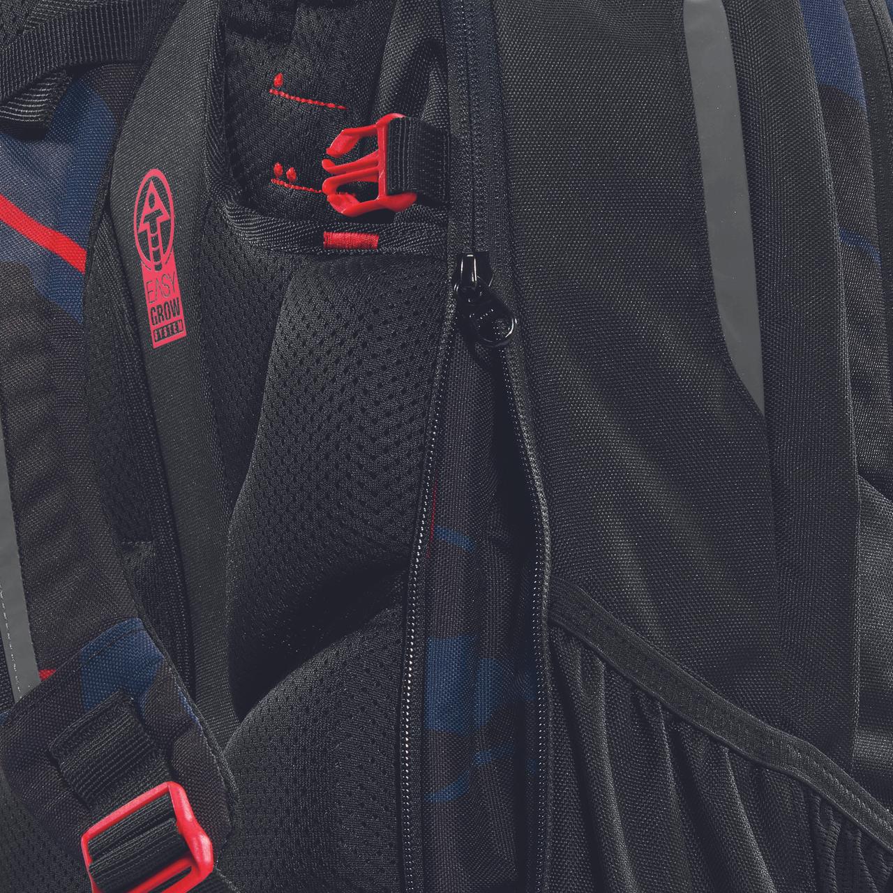 PORTER - das geräumige Multitalent. Geeignet ist der Rucksack ab der 5. Klasse. Der Schulrucksack verfügt über einen Stauraum von 30 + 5 Litern, der auf 5 Fächer aufgeteilt ist: zwei Hauptfächer mit einem Bücherfach, ein Organizerfach, eine Fronttasche und ein weiteres Frontfach. Ebenfalls verfügt der Rucksack über zwei Netz-Außentasche und einem Fach am Hüftgurt. Durch das Easy-Grow-System lässt er sich problemlos auf die aktuelle Rückenlänge einstellen (Körpergröße von 135 - 180 cm). Ein einfacher Drehmechanismus, mit entsprechender Skala, ermöglicht die Höhenverstellung der Schulterträger (während das Kind den Rucksack trägt). Durch die Riemen auf Schulterhöhe und die Kompressionsriemen an den Seiten lässt sich das Gewicht nah am Rücken verteilen. Um eine optimale Stabilisierung und Entlastung der Schultergelenke zu gewährleisten, verfügt der Ranzen über einen höhen- und längenverstellbaren Brustgurt. Durch diese Funktion wird das Gewicht gleichmäßig verteilt und die Schultern entlastet. Darüber hinaus sorgt die Pull-Forward Funktion des breiten Hüftgurtes dafür, dass das Gewicht des Ranzens auf das stabile Becken deines Kindes gelagert wird. Das atmungsaktive und gepolsterte Rückenteil ermöglicht eine gute Luftzirkulation. Durch den standfesten sowie gepolsterten Rucksackboden, bekommt der Rucksack einen festen Stand. Reflektierende Flächen sorgen für mehr Sichtbarkeit auf dem Schulweg. Für noch mehr Sicherheit am Schulweg kann ein zusätzliches LED-Stecklicht an der Schultasche befestigen werden. Die Herstellung erfolgt PVC-frei, sowie aus 40 recycelten PET-Flaschen (0,5 l). Wasserabweisend, Polyester mit 100% PFC-freier und bluesign-zertifizierter Beschichtung.