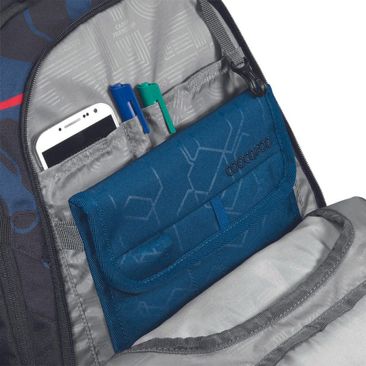 PORTER - das geräumige Multitalent. Geeignet ist der Rucksack ab der 5. Klasse. Der Schulrucksack verfügt über einen Stauraum von 30 + 5 Litern, der auf 5 Fächer aufgeteilt ist: zwei Hauptfächer mit einem Bücherfach, ein Organizerfach, eine Fronttasche und ein weiteres Frontfach. Ebenfalls verfügt der Rucksack über zwei Netz-Außentasche und einem Fach am Hüftgurt. Durch das Easy-Grow-System lässt er sich problemlos auf die aktuelle Rückenlänge einstellen (Körpergröße von 135 - 180 cm). Ein einfacher Drehmechanismus, mit entsprechender Skala, ermöglicht die Höhenverstellung der Schulterträger (während das Kind den Rucksack trägt). Durch die Riemen auf Schulterhöhe und die Kompressionsriemen an den Seiten lässt sich das Gewicht nah am Rücken verteilen. Um eine optimale Stabilisierung und Entlastung der Schultergelenke zu gewährleisten, verfügt der Ranzen über einen höhen- und längenverstellbaren Brustgurt. Durch diese Funktion wird das Gewicht gleichmäßig verteilt und die Schultern entlastet. Darüber hinaus sorgt die Pull-Forward Funktion des breiten Hüftgurtes dafür, dass das Gewicht des Ranzens auf das stabile Becken deines Kindes gelagert wird. Das atmungsaktive und gepolsterte Rückenteil ermöglicht eine gute Luftzirkulation. Durch den standfesten sowie gepolsterten Rucksackboden, bekommt der Rucksack einen festen Stand. Reflektierende Flächen sorgen für mehr Sichtbarkeit auf dem Schulweg. Für noch mehr Sicherheit am Schulweg kann ein zusätzliches LED-Stecklicht an der Schultasche befestigen werden. Die Herstellung erfolgt PVC-frei, sowie aus 40 recycelten PET-Flaschen (0,5 l). Wasserabweisend, Polyester mit 100% PFC-freier und bluesign-zertifizierter Beschichtung.