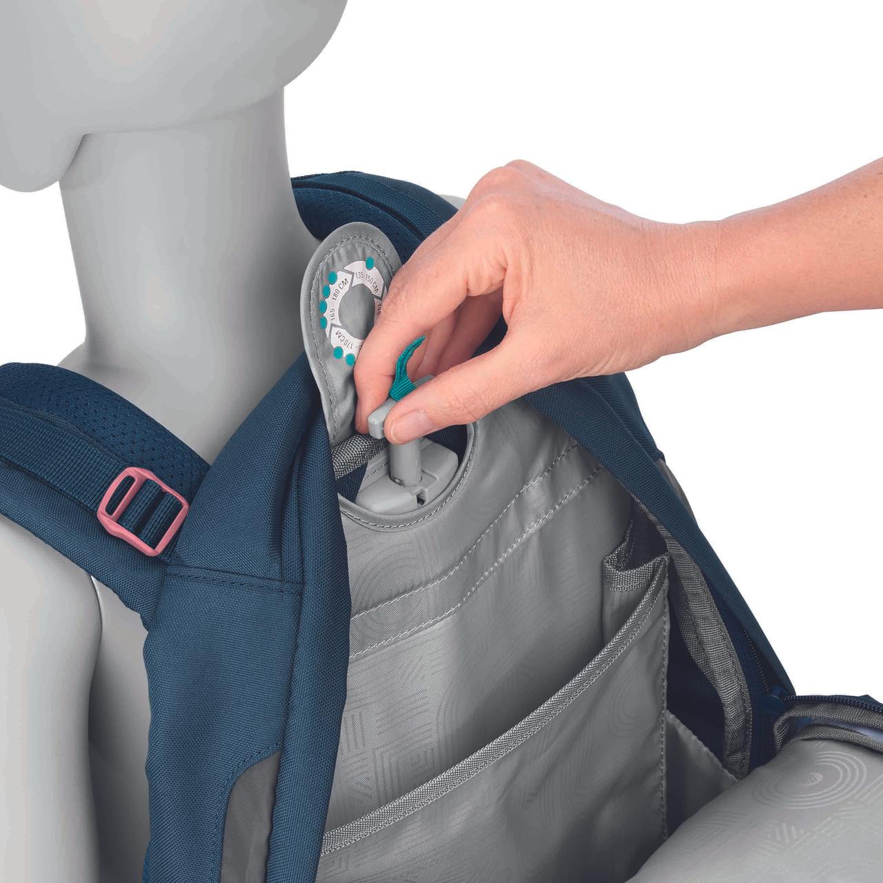 - Lageverstellriemen für Anpassung an den Rücken, sowie Höhenverstellbarer Brustgurt und abnehmbarer Hüftgurt