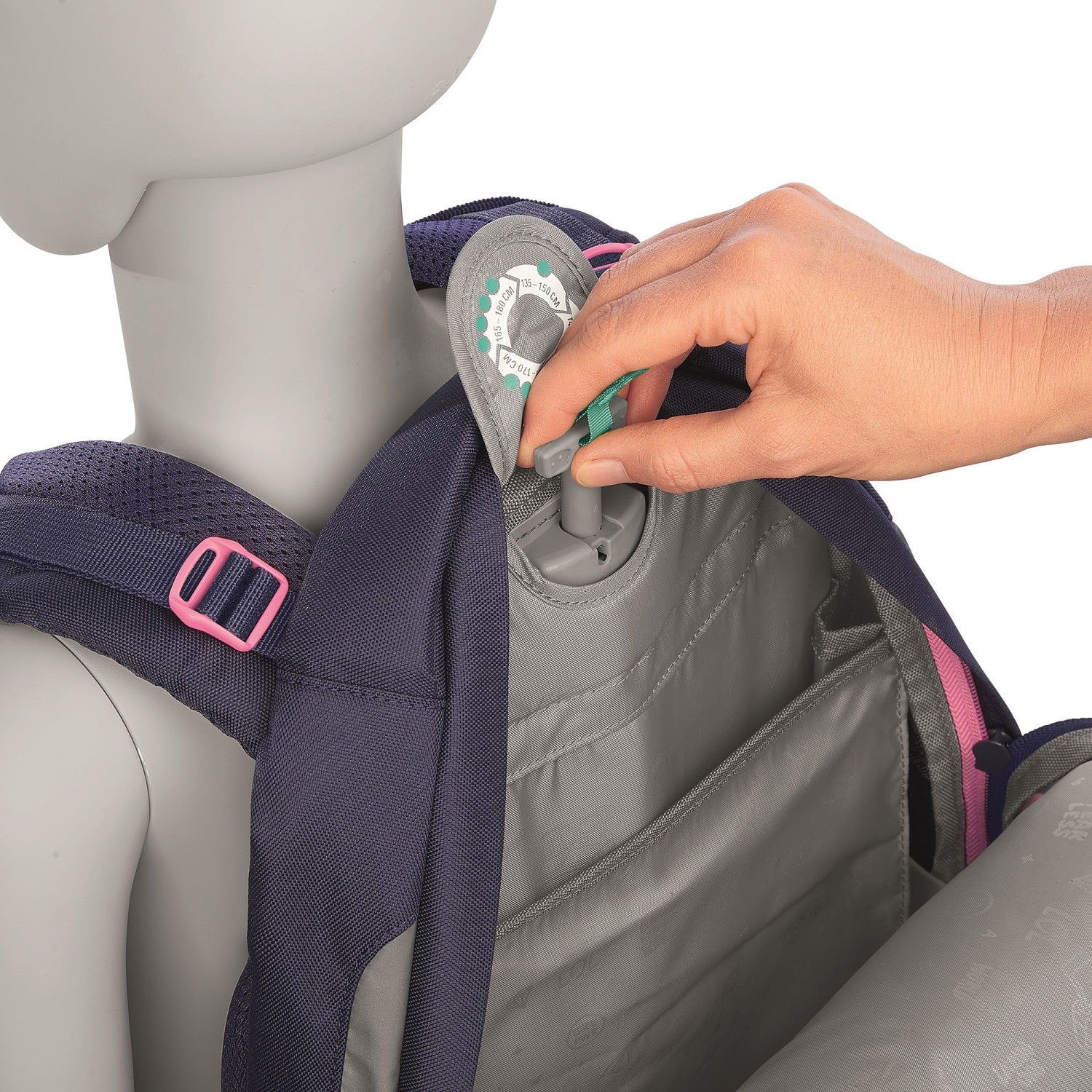 MATE - der Allrounder. Geeignet ist der Rucksack ab der 5. Klasse. Mehrere Fächer ermöglichen es, alle Schulutensilien geordnet und griffbereit zu verstauen: zwei Hauptfächer mit einem Bücherfach, ein Organizerfach, eine Fronttasche und zwei Netz-Außentaschen. Durch das Easy-Grow-System lässt er sich problemlos auf die aktuelle Rückenlänge einstellen (Körpergröße von 135 - 180 cm). Ein einfacher Drehmechanismus, mit entsprechender Skala, ermöglicht die Höhenverstellung der Schulterträger (während das Kind den Rucksack trägt). Durch die Riemen auf Schulterhöhe und die Kompressionsriemen an den Seiten lässt sich das Gewicht nah am Rücken verteilen. Um eine optimale Stabilisierung und Entlastung der Schultergelenke zu gewährleisten, verfügt der Ranzen über einen höhen- und längenverstellbaren Brustgurt. Durch diese Funktion wird das Gewicht gleichmäßig verteilt und die Schultern entlastet. Darüber hinaus sorgt die Pull-Forward Funktion des breiten Hüftgurtes dafür, dass das Gewicht des Ranzens auf das stabile Becken deines Kindes gelagert wird. Das atmungsaktive und gepolsterte Rückenteil ermöglicht eine gute Luftzirkulation. Durch den standfesten sowie gepolsterten Rucksackboden, bekommt der Rucksack einen festen Stand. Reflektierende Flächen sorgen für mehr Sichtbarkeit auf dem Schulweg. Für noch mehr Sicherheit am Schulweg kann ein zusätzliches LED-Stecklicht an der Schultasche befestigen werden. Die Herstellung erfolgt PVC-frei, sowie aus 34 recycelten PET-Flaschen (0,5 l). Wasserabweisend, Polyester mit 100% PFC-freier und bluesign-zertifizierter Beschichtung.