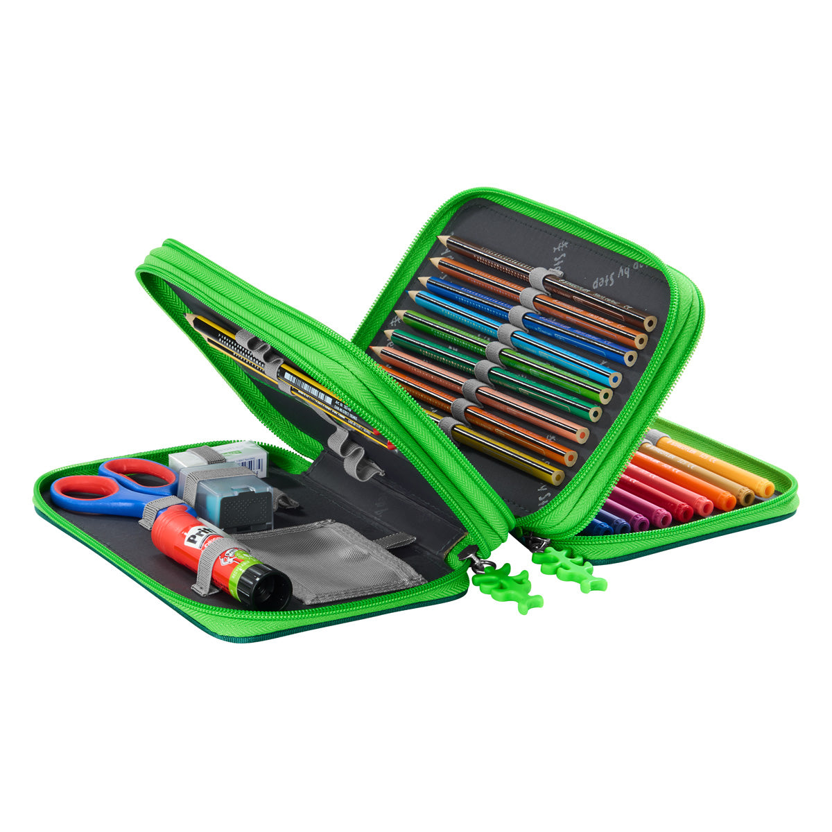 Das 43-teilige XXL-Mäppchen von Step by Step ist ein wahres Organisationstalent, denn hier herrscht nie wieder Chaos! Alle Schreib- und Bastelutensilien haben einen eigenen Platz und können sicher verstaut werden. Die 3 Fächer lassen sich ganz einfach durch ein 2-Wege-Rundbogenreißverschluss öffnen und schließen. Strapazierfähiges und wasserabweisendes Material mit PFC-freier Beschichtung. Aus recycelten PET-Flaschen hergestellt.