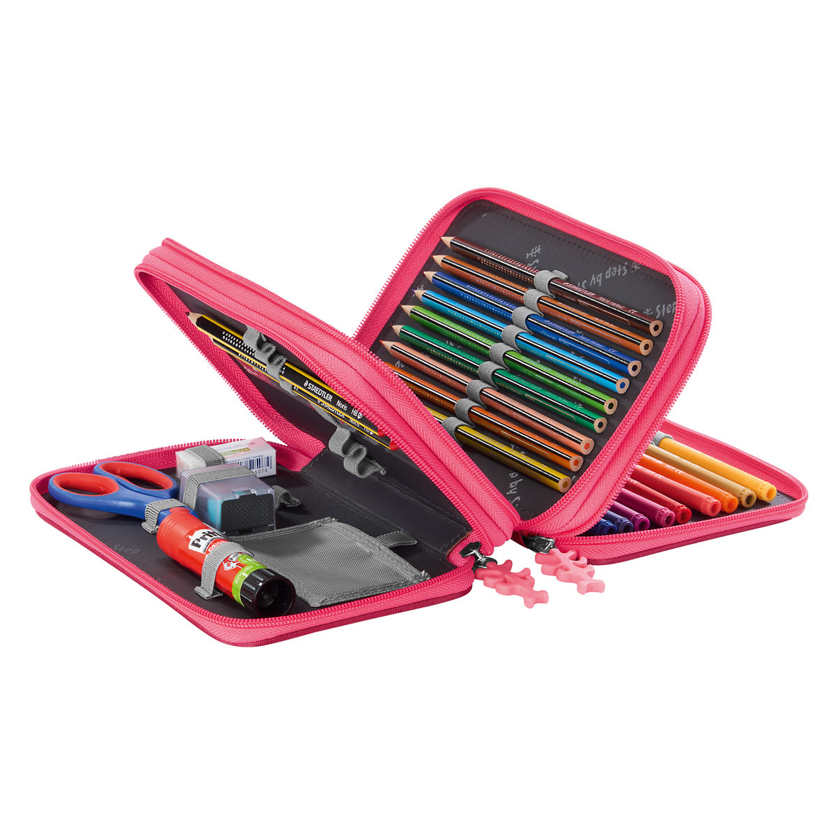 Das 43-teilige XXL-Mäppchen von Step by Step ist ein wahres Organisationstalent, denn hier herrscht nie wieder Chaos! Alle Schreib- und Bastelutensilien haben einen eigenen Platz und können sicher verstaut werden. Die 3 Fächer lassen sich ganz einfach durch ein 2-Wege-Rundbogenreißverschluss öffnen und schließen. Strapazierfähiges und wasserabweisendes Material mit PFC-freier Beschichtung. Aus recycelten PET-Flaschen hergestellt.